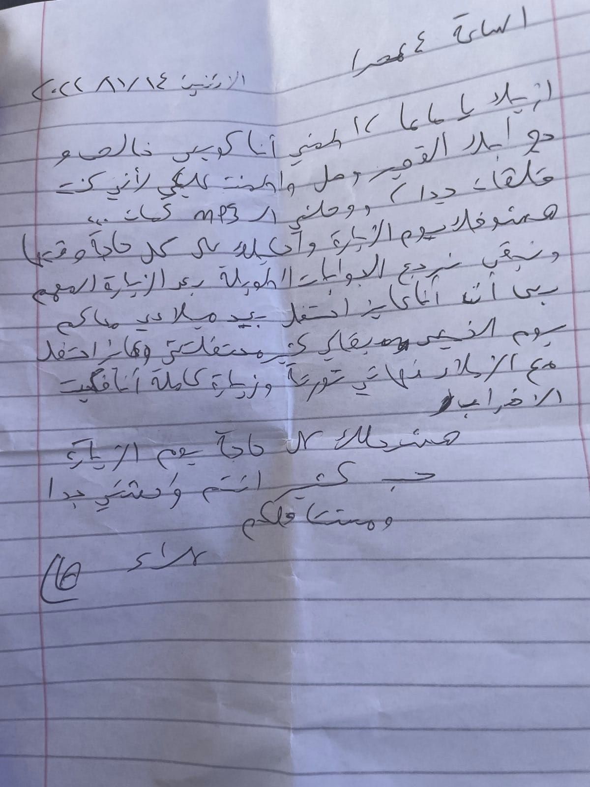 وكتب "علاء" فى خطابه يقول: "إزيك يا ماما أنا كويس خالص وجوابك القصير وصل، واطمنت عليكي لأنى كنت قلقان جدًا، ووصلنى الـ mp3 كمان".